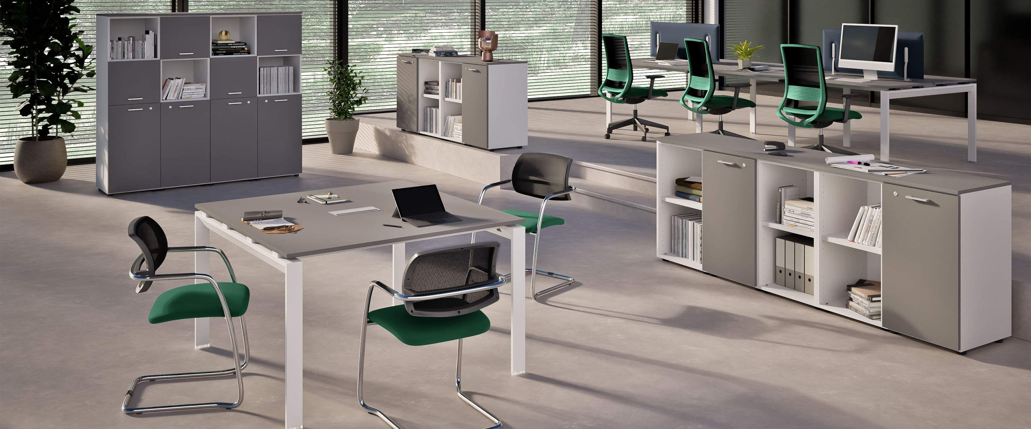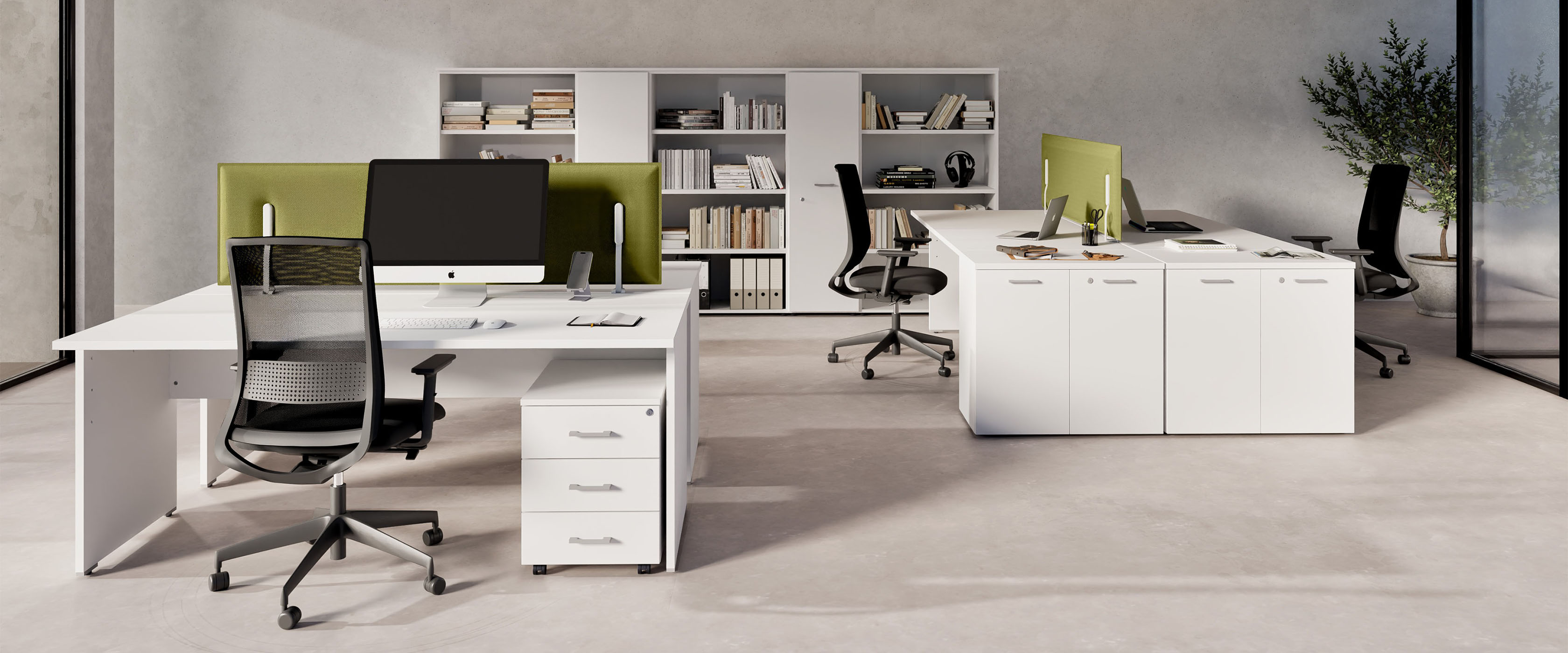 Scrivanie, tavoli e sedute, pareti mobili componibili, poltrone per ufficio, scaffalature metalliche.